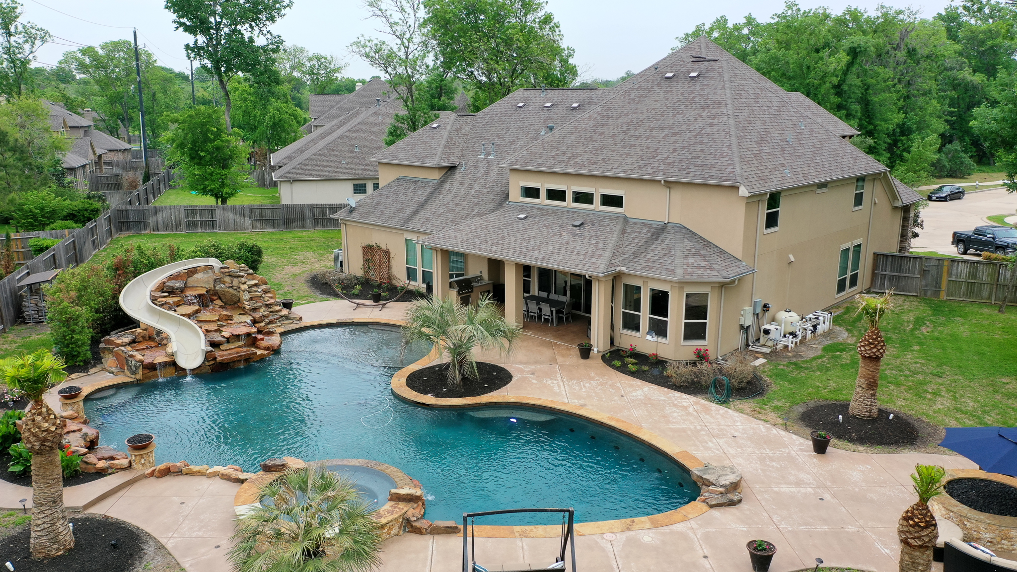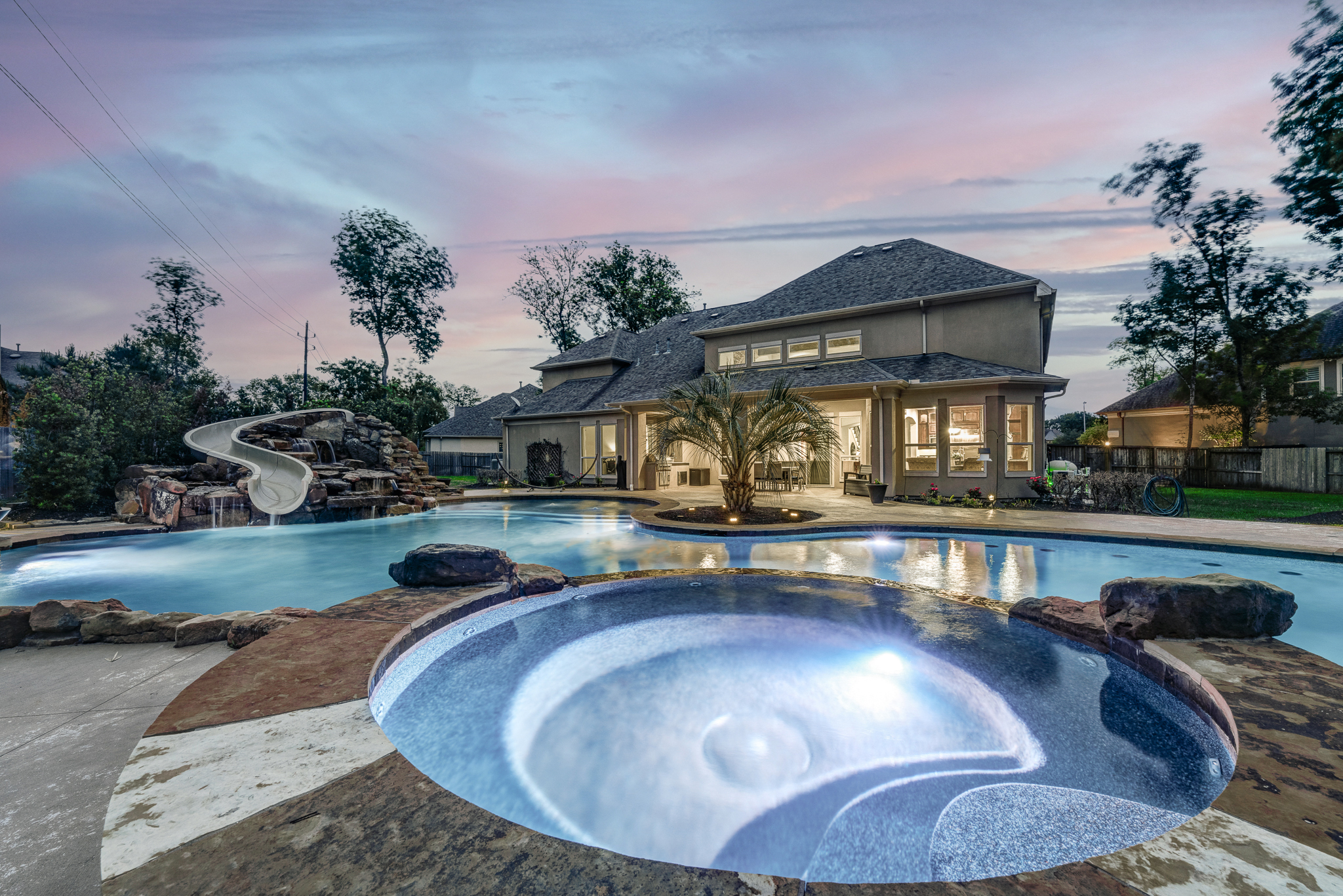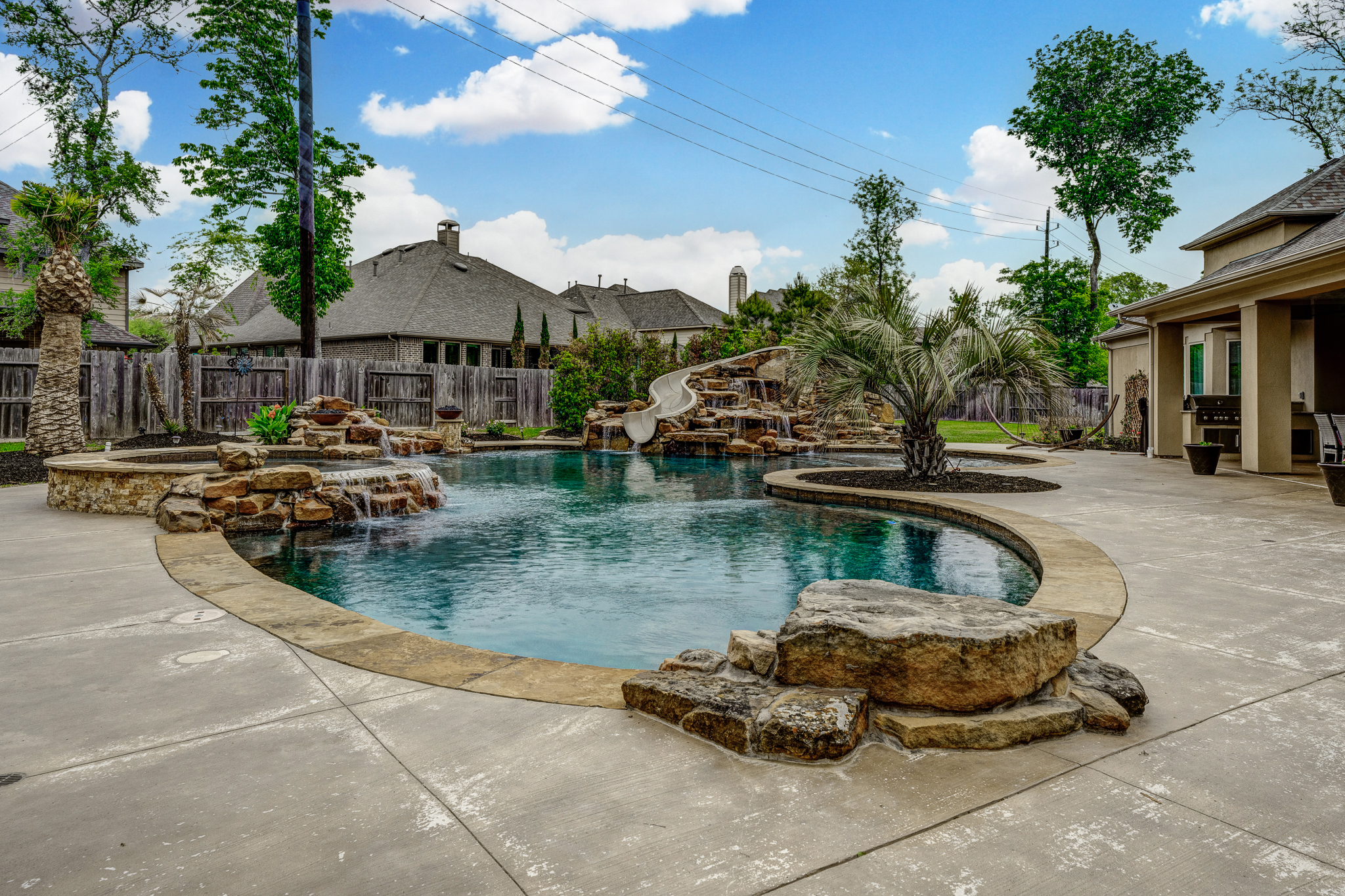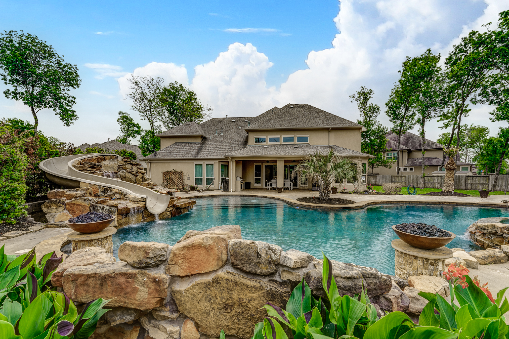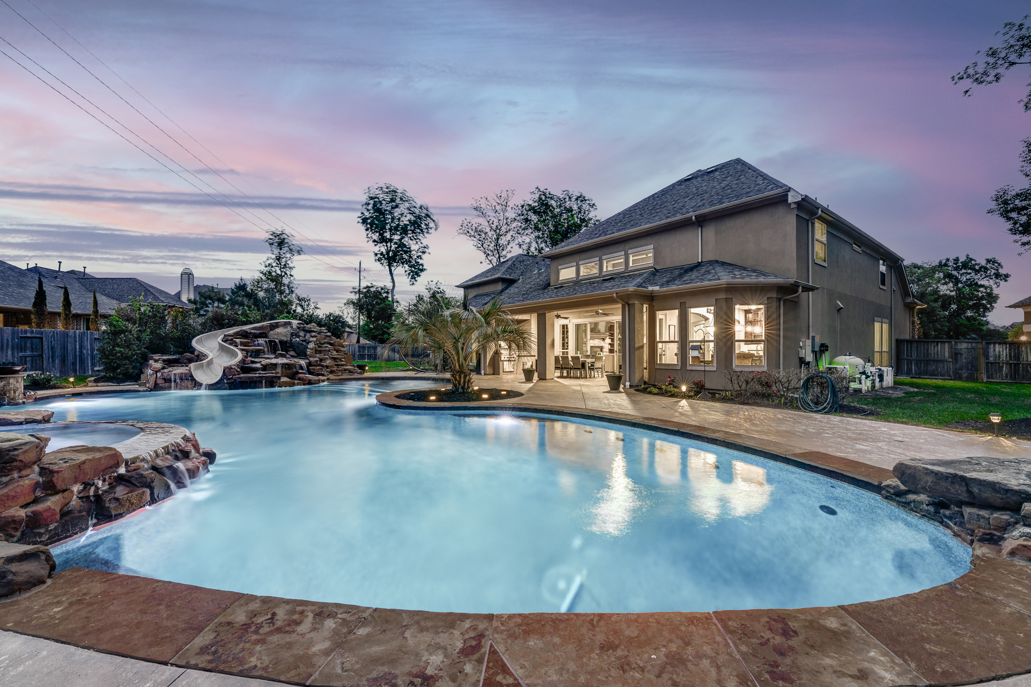 Breathtaking 6-bed, 4.5-bath property by J. Patrick Homes on graciously proportioned cul-de-sac lot across from nature area in Sienna Plantation. 107-yd wide backyard tropical retreat featuring a covered patio, outdoor kitchen, pool with rock waterfall and slide, spa, firepit, and ample green space. Other features include grand 2-story foyer, wrought iron spindles, built-ins and granite countertops throughout, study with French doors and coffered ceiling, formal dining room, spacious living area with wood beam ceiling, floor-to-ceiling stone fireplace, and large glass doors leading out to the backyard, game room, media room, and 2-car side swing-in garage plus a 1-car garage. The gourmet kitchen boasts a stainless steel farmhouse sink, walk-in pantry, butler’s pantry with wine fridge, and top-of-the-line appliances, including Thermador 6-burner gas cooktop with griddle and a double oven. The primary suite boasts a walk-in closet, separate vanities, jetted tub, and frameless shower.