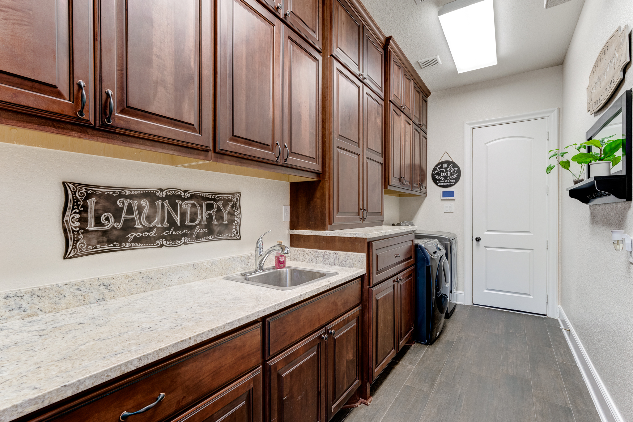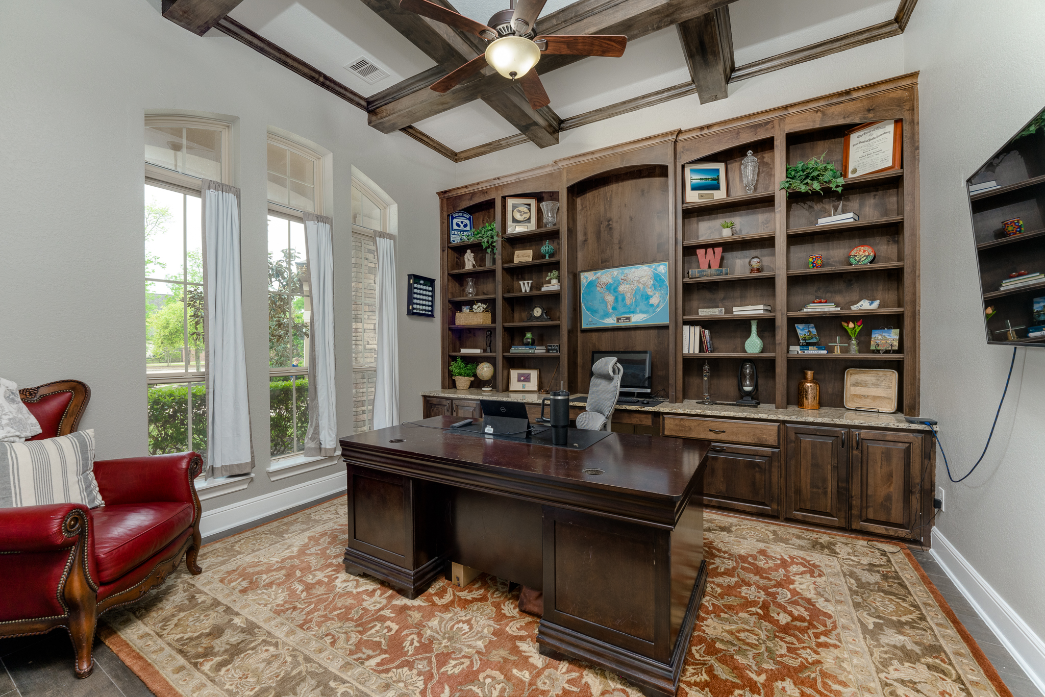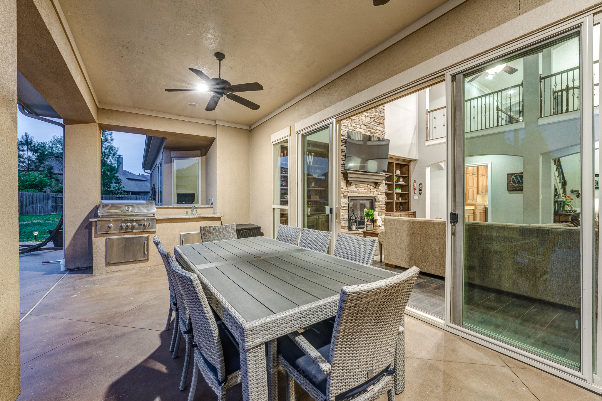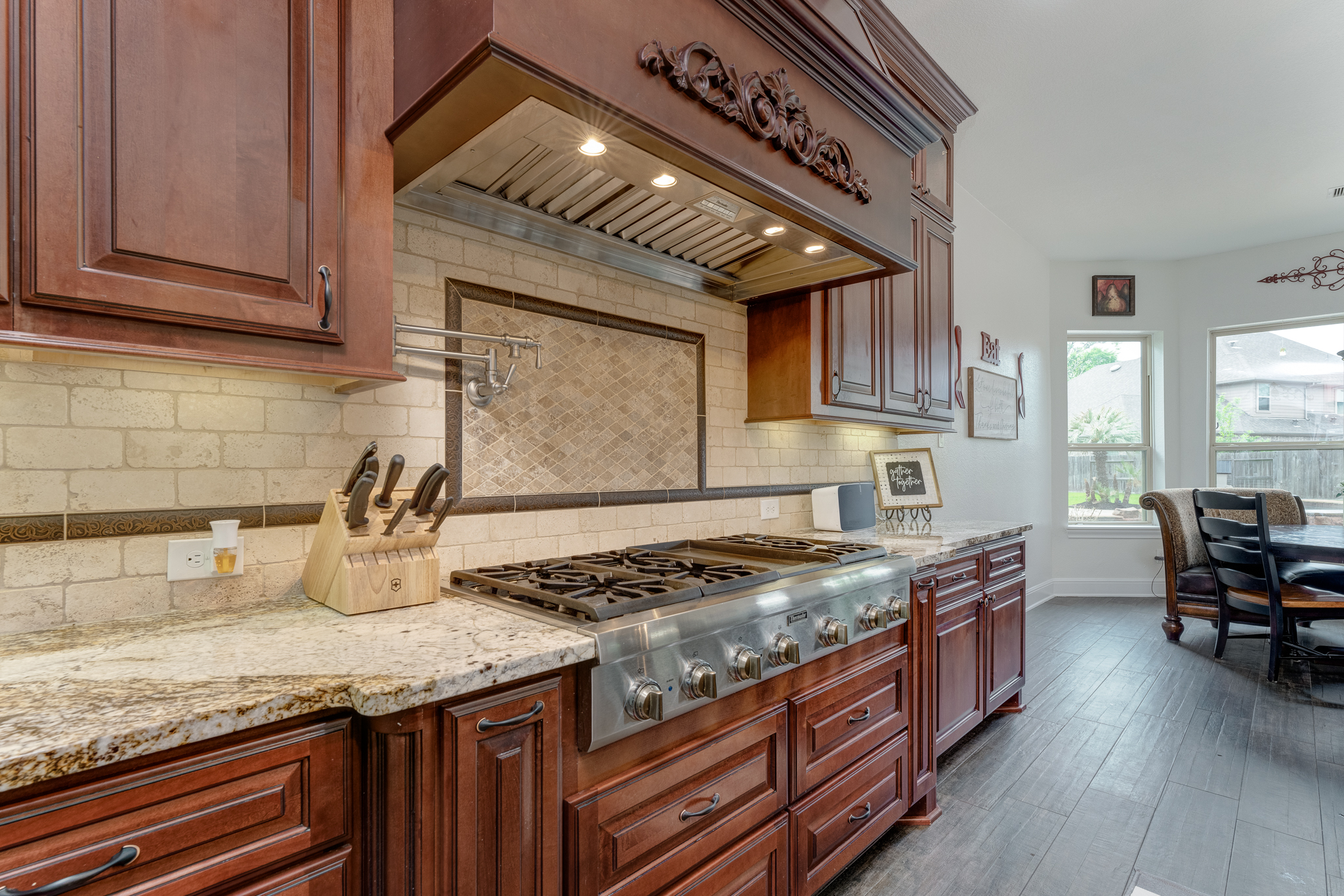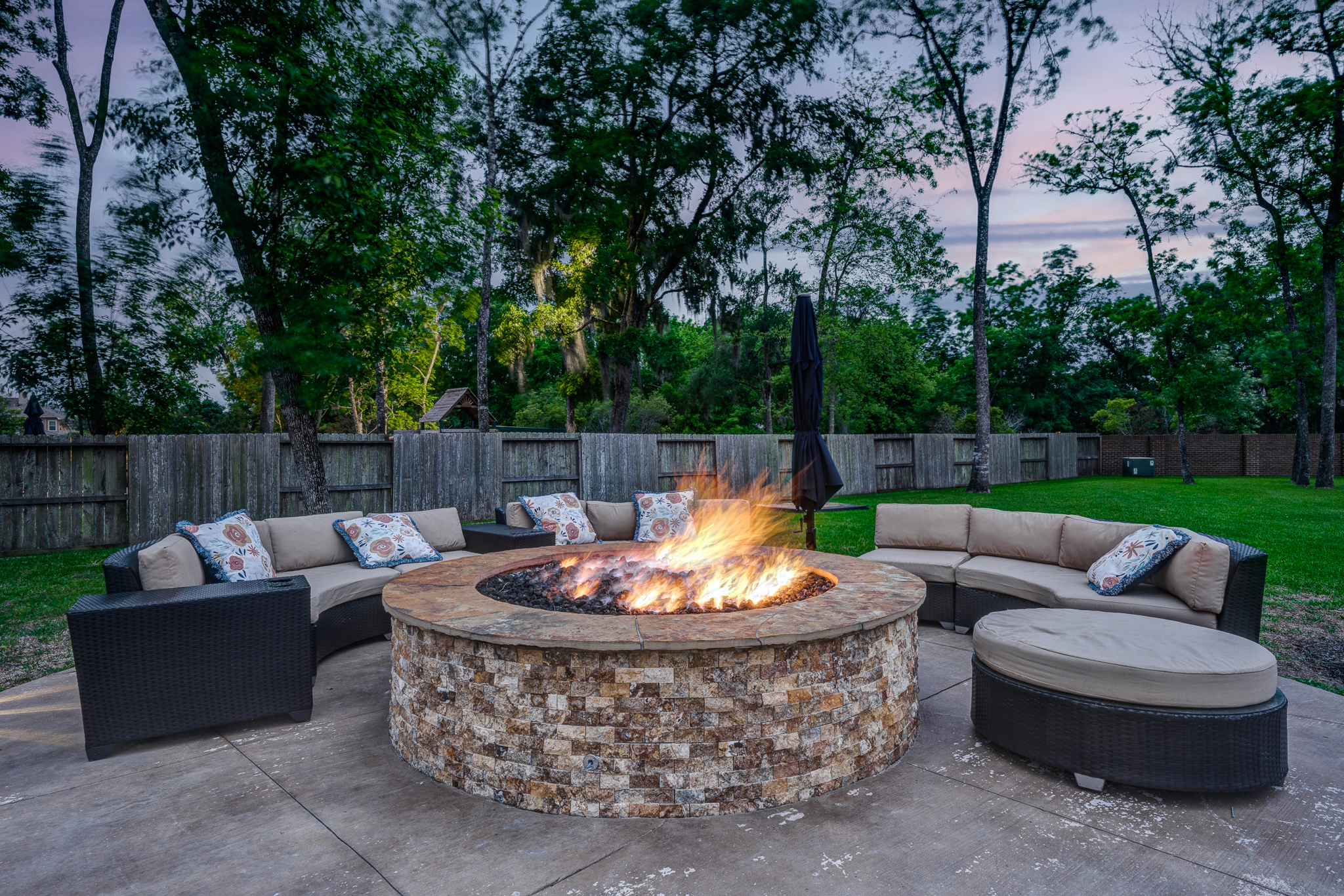 Breathtaking 6-bed, 4.5-bath property by J. Patrick Homes on graciously proportioned cul-de-sac lot across from nature area in Sienna Plantation. 107-yd wide backyard tropical retreat featuring a covered patio, outdoor kitchen, pool with rock waterfall and slide, spa, firepit, and ample green space. Other features include grand 2-story foyer, wrought iron spindles, built-ins and granite countertops throughout, study with French doors and coffered ceiling, formal dining room, spacious living area with wood beam ceiling, floor-to-ceiling stone fireplace, and large glass doors leading out to the backyard, game room, media room, and 2-car side swing-in garage plus a 1-car garage. The gourmet kitchen boasts a stainless steel farmhouse sink, walk-in pantry, butler’s pantry with wine fridge, and top-of-the-line appliances, including Thermador 6-burner gas cooktop with griddle and a double oven. The primary suite boasts a walk-in closet, separate vanities, jetted tub, and frameless shower.