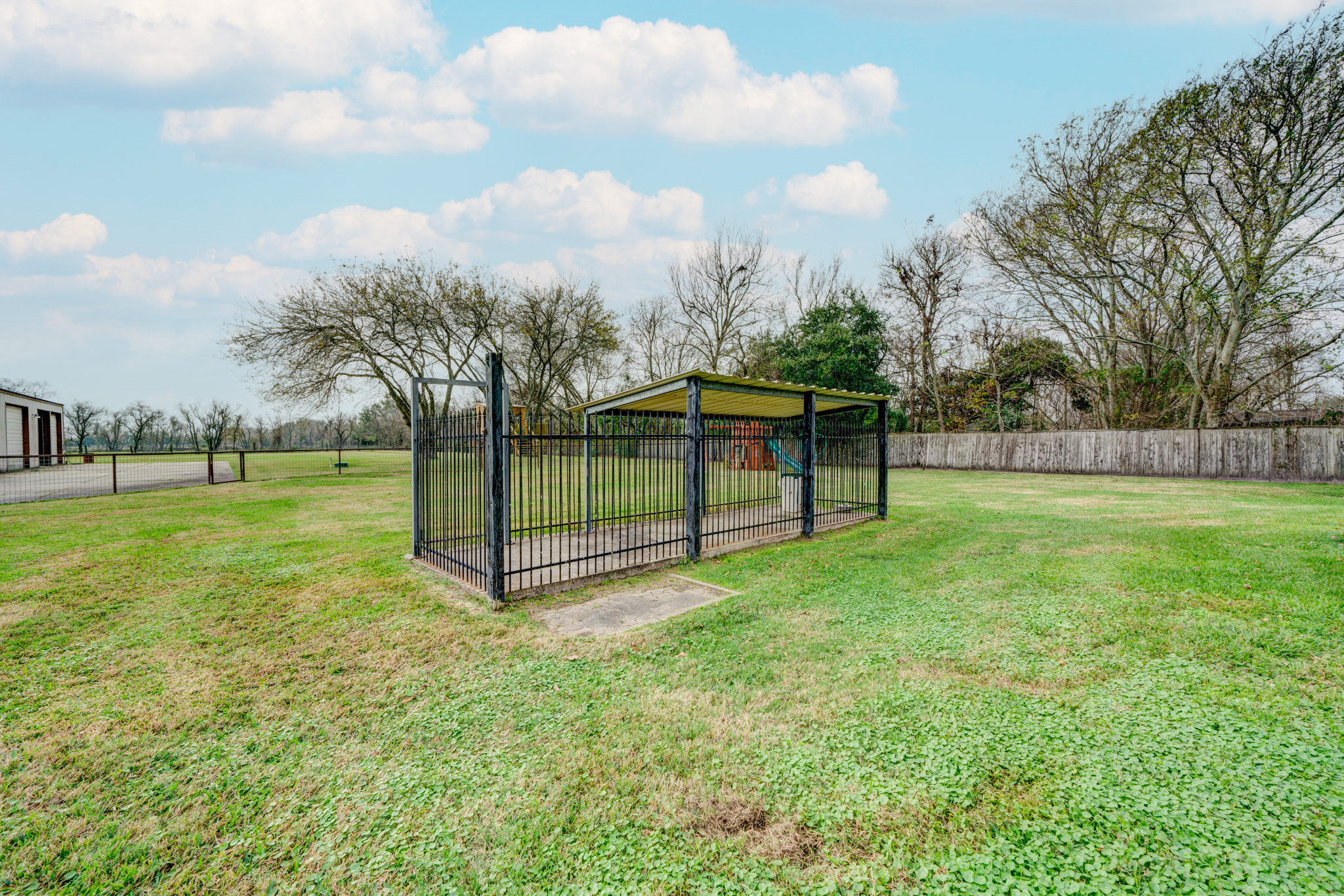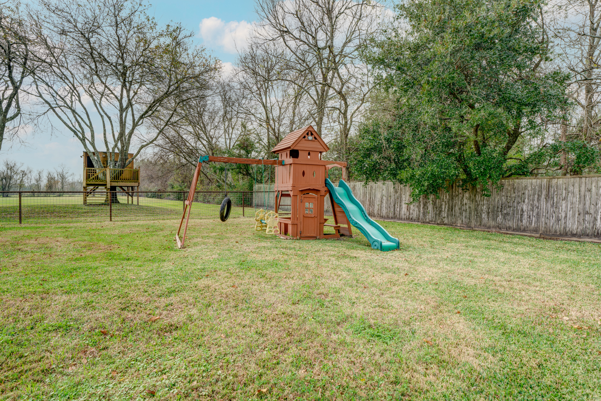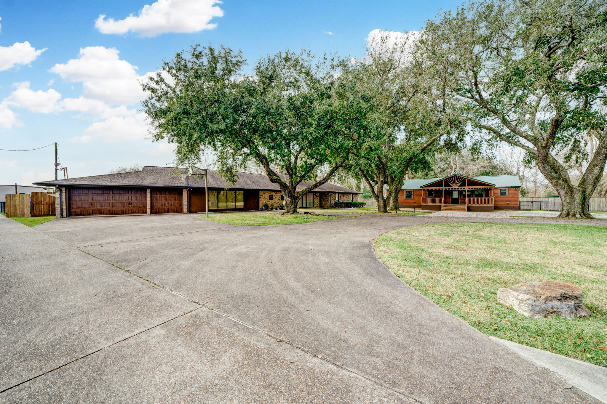 This beautiful property resides on 2.5 acres in Baytown and offers exceptional living and work spaces, as well as potential for rental income! The impressive 3,300 sq ft main house features 4 bedrooms, 3.5 bathrooms, an oversized 3-car garage, island kitchen with lots of storage space, 2 spacious primary suites, a large game room, and open concept living area with custom details like a wood beam ceiling, plantation shutters, double sided floor-to-ceiling stone fireplace, a wet bar, sliding barn door, and built-ins. Property also features a 2-bedroom, 2-bathroom Leland’s tiny house that can be used as a rental opportunity or additional housing. Other notable features include a versatile shop/office space with a bedroom, full bathroom, and kitchen, a covered tile patio, sparkling swimming pool, ample parking space, RV hook ups, a dog pen, well, and charming treehouse with electricity and a ceiling fan.